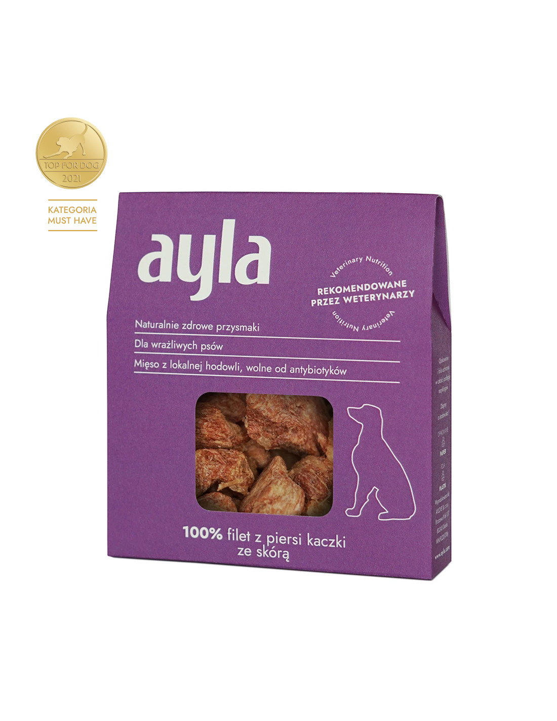 Liofilizowany filet z piersi kaczki ze skórą charakteryzuje się wysoką zawartością białka. Jest źródłem nienasyconych kwasów tłuszczowych, tak korzystnych dla zdrowia, jak również mikroelementów takich jak potas, żelazo, fosfor, magnez i witaminy A oraz witamin z grupy B, które przyczyniają się do prawidłowego metabolizmu i wzmocnienia psiej odporności. Liofilizowane kawałki mięsa idealnie sprawdzą się w treningu lub jako urozmaicenie codziennej psiej diety. Są odpowiednie również dla szczeniąt.
