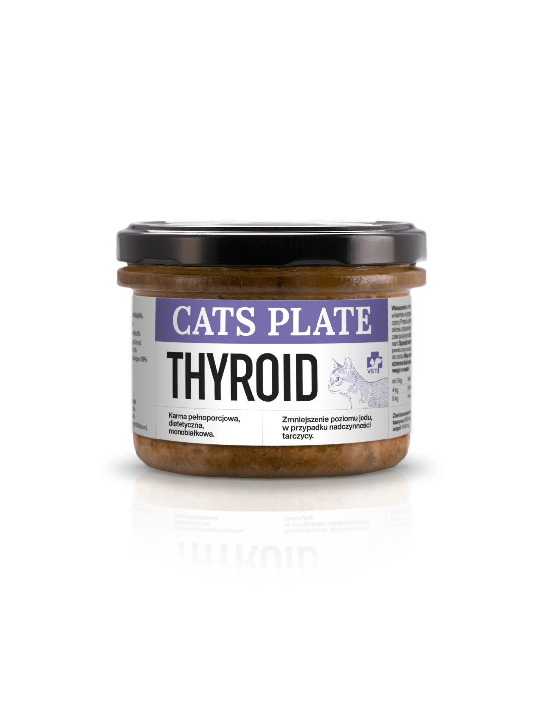 Cats Plate Vet Thyroid to specjalistyczna, pełnoporcjowa, monobiałkowa, mokra karma dla kotów z nadczynnością tarczycy. Opracowana przez specjalistów w oparciu o najnowsze badania dotyczące postępowania w przypadku tego schorzenia.