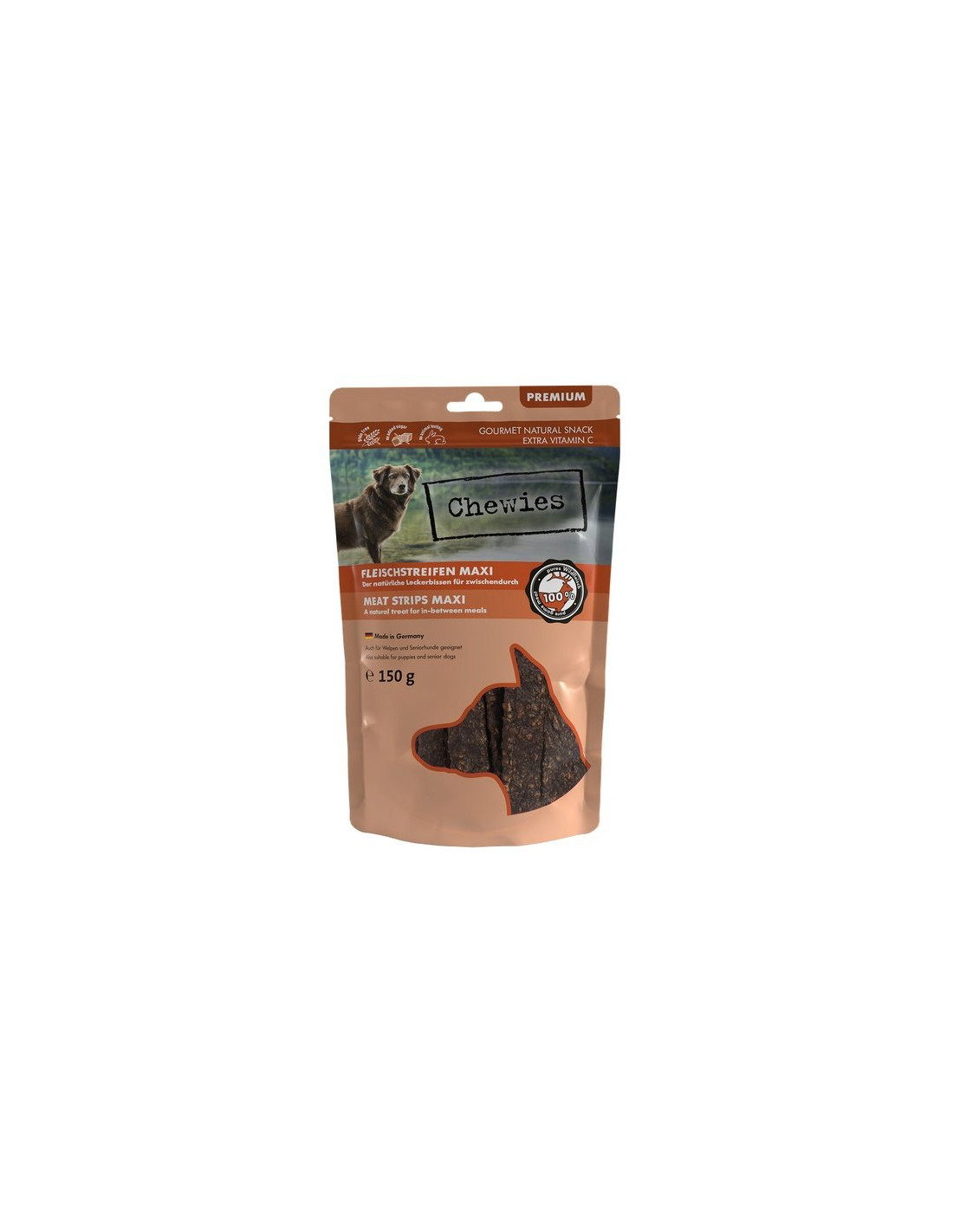 Chewies Maxi Meat/Fish Strips są tworzone z mielonego i delikatnie suszonego na powietrzu mięsa z dodatkiem witaminy C. Dzięki specjalnej produkcji wysokiej jakości składniki odżywcze mięsa są prawie całkowicie zachowane. Paski mięsne/rybne do żucia to smaczny i zdrowy przysmak między posiłkami. Są wyprodukowane w Niemczech. Paski Chewies Maxi Meat/Fish Strips mają przybliżoną długość 10 cm i od 2 do 3 cm szerokości. Można je także łatwo podzielić.