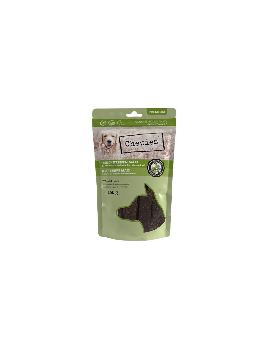Chewies Maxi Meat/Fish Strips są tworzone z mielonego i delikatnie suszonego na powietrzu mięsa z dodatkiem witaminy C. Dzięki specjalnej produkcji wysokiej jakości składniki odżywcze mięsa są prawie całkowicie zachowane. Paski mięsne/rybne do żucia to smaczny i zdrowy przysmak między posiłkami. Są wyprodukowane w Niemczech. Paski Chewies Maxi Meat/Fish Strips mają przybliżoną długość 10 cm i od 2 do 3 cm szerokości. Można je także łatwo podzielić.