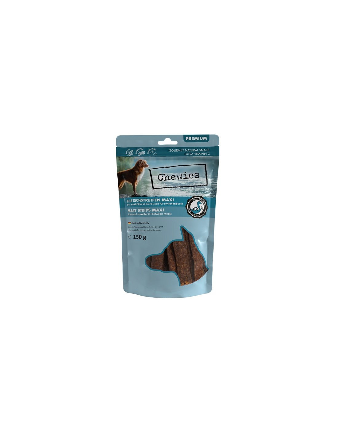 Chewies Meat/Fish Strips Maxi są tworzone z mielonego i delikatnie suszonego na powietrzu mięsa z dodatkiem witaminy C. Dzięki specjalnej produkcji wysokiej jakości składniki odżywcze mięsa są prawie całkowicie zachowane. Paski mięsne/rybne do żucia to smaczny i zdrowy przysmak między posiłkami. Są wyprodukowane w Niemczech. Paski Chewies Meat/Fish Strips Maxi mają przybliżoną długość 10 cm i od 2 do 3 cm szerokości. Można je także łatwo podzielić.