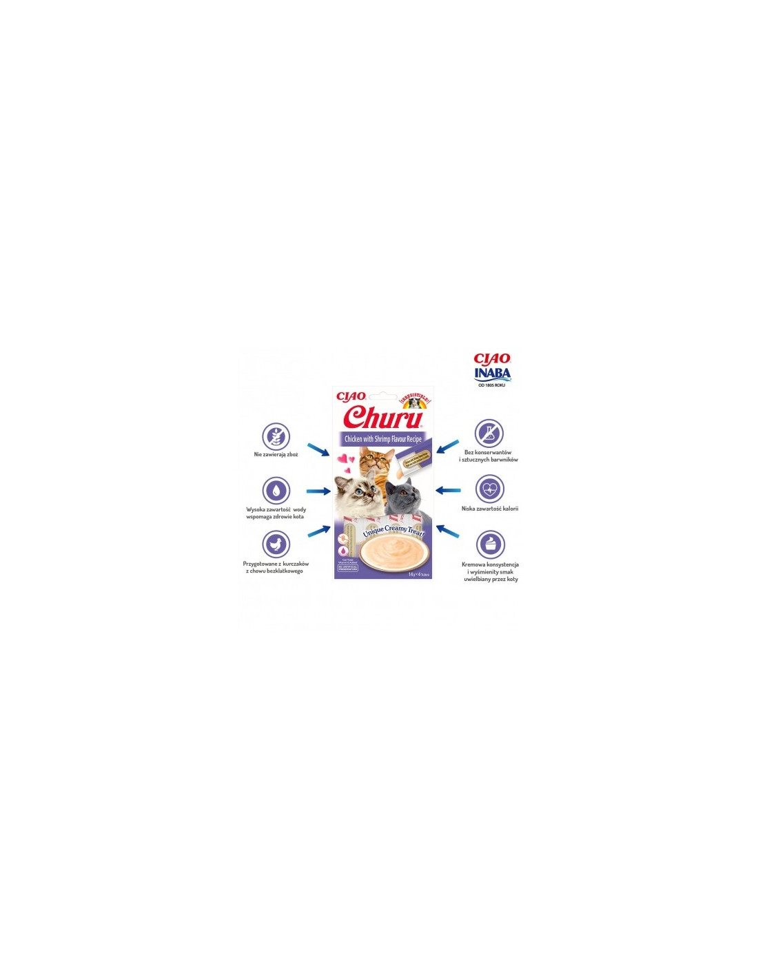 Dlaczego Inaba Ciao Churu to najlepszy przysmak dla kota? Fenomen pochodzących z Japonii przekąsek churu to efekt ich oryginalnej, uwielbianej przez koty formy. Kremowa mięsna pasta, wilgotna i aromatyczna, na pewno trafi w gust także Twojego mruczka - ulubione smaki, wysoka zawartość mięsa i wygodne opakowanie, które pozwala karmić kota z ręki, to wszystko, czego Wam trzeba. Churu to także dodatkowa porcja wody, co jest szczególnie ważne, gdy kot pije za mało. Alternatywa dla suchych kalorycznych przekąsek? Tak - to właśnie Inaba Ciao Churu, zdrowy przysmak dla Twojego pupila. Inaba Ciao Churu Kurczak Krewetki - kąsek dla kota o dobrym składzie! Mięso kurczaka to główny składnik naszego churu - pochodzi z certyfikowanych ferm, od kurczaków wolnowybiegowych. W tej wersji smakowej producent wzbogacił skład o naturalny ekstrakt z krewetek, który dodatkowo zachęci każdego kota do jedzenia. Inaba Ciao Churu są niskokaloryczne, pozbawione dodatku zbóż, konserwantów i sztucznych barwników, dlatego można bezpiecznie podawać je między posiłkami nawet najbardziej wymagającym kotom w każdym wieku.