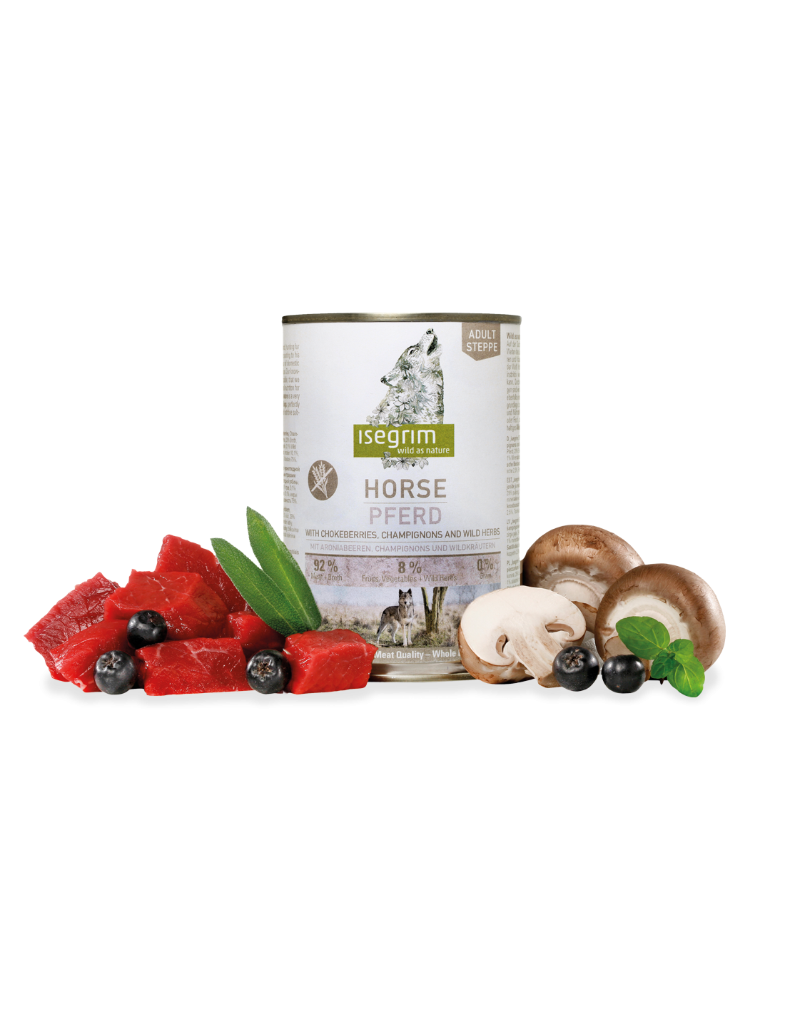 Isegrim Horse to wyśmienita karma z koniną, owocami aronii, białą pieczarką i mieszanką dzikich ziół.