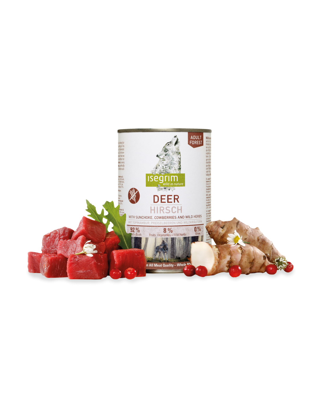 Isegrim Deer to wyśmienita karma z mięsem jelenia, słonecznikiem bulwiastym, borówką brusznicą i mieszanką dzikich ziół.