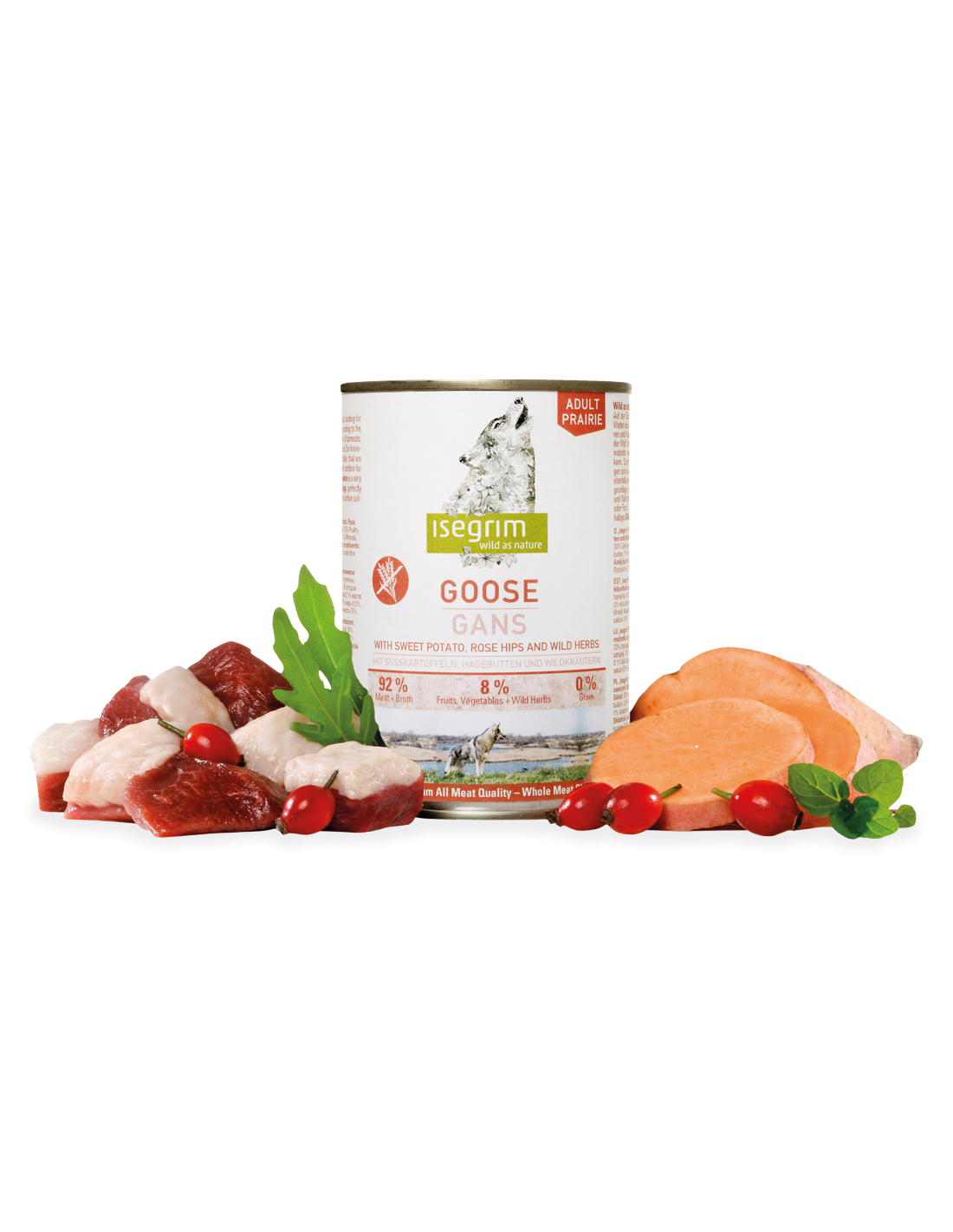 Isegrim Goose to wyśmienita karma z gęsiną, słodkimi ziemniakami, owocami dzikiej róży i mieszanką dzikich ziół.