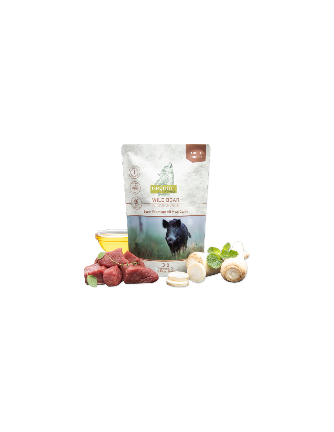 Isegrim Roots Adult Wild Boar to wyśmienita karma z dzika z dodatkiem pasternaka, oleju lnianego i ziół leśnych.