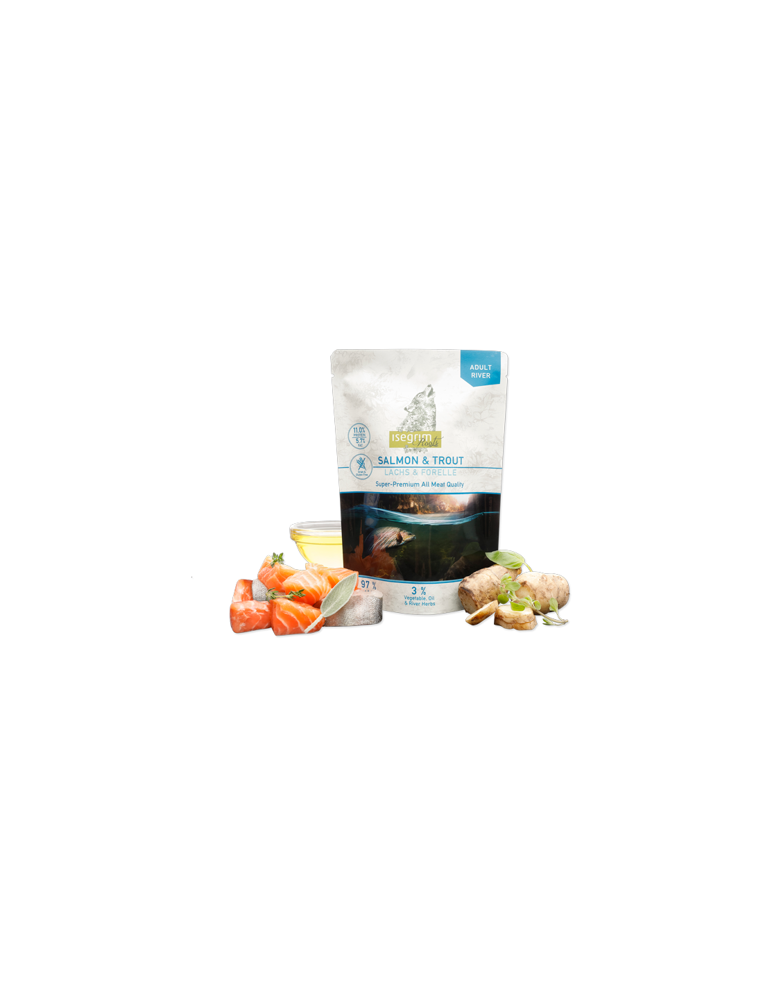 Isegrim Roots Adult Salmon & Trout to wyśmienita karma z łososia i pstrąga z dodatkiem topinamburu, oleju szafranowego i ziołami rzecznymi.