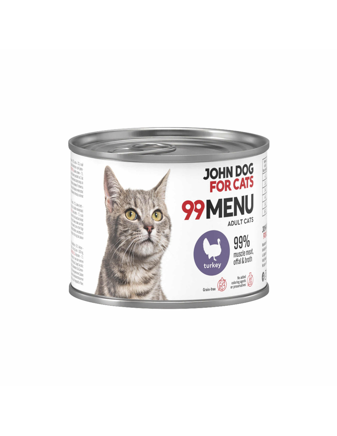 Skład: Kurczak - 55% (mięso mięśniowe - 50%, wątróbka - 5%), indyk - 28% (mięso mięśniowe - 26%, serca - 2%), rosół z indyka - 16%, minerały - 0,9%, tauryna – 0,1%.   Ze względu na charakter produkcji produkt może zawierać niewielkie ilości ryżu oraz mięsa innych gatunków zwierząt.