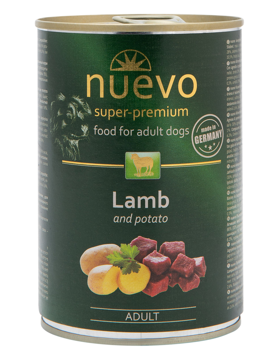 Nuevo jagnięcina z ziemniakami. Klasyczna karma dla psów dorosłych. Klasyczna receptura zawiera świeżą, doskonałej jakości jagnięcinę (doskonałe źródło białka o wysokiej wartości biologicznej) oraz ziemniaki (niezbędne węglowodany). Ta idealnie zbilansowana i kompletna karma odpowiada na wszystkie potrzeby żywieniowe dorosłych psów. Wspomaga odporność i witalność oraz gwarantuje odpowiednią kondycję psa przez długie lata.