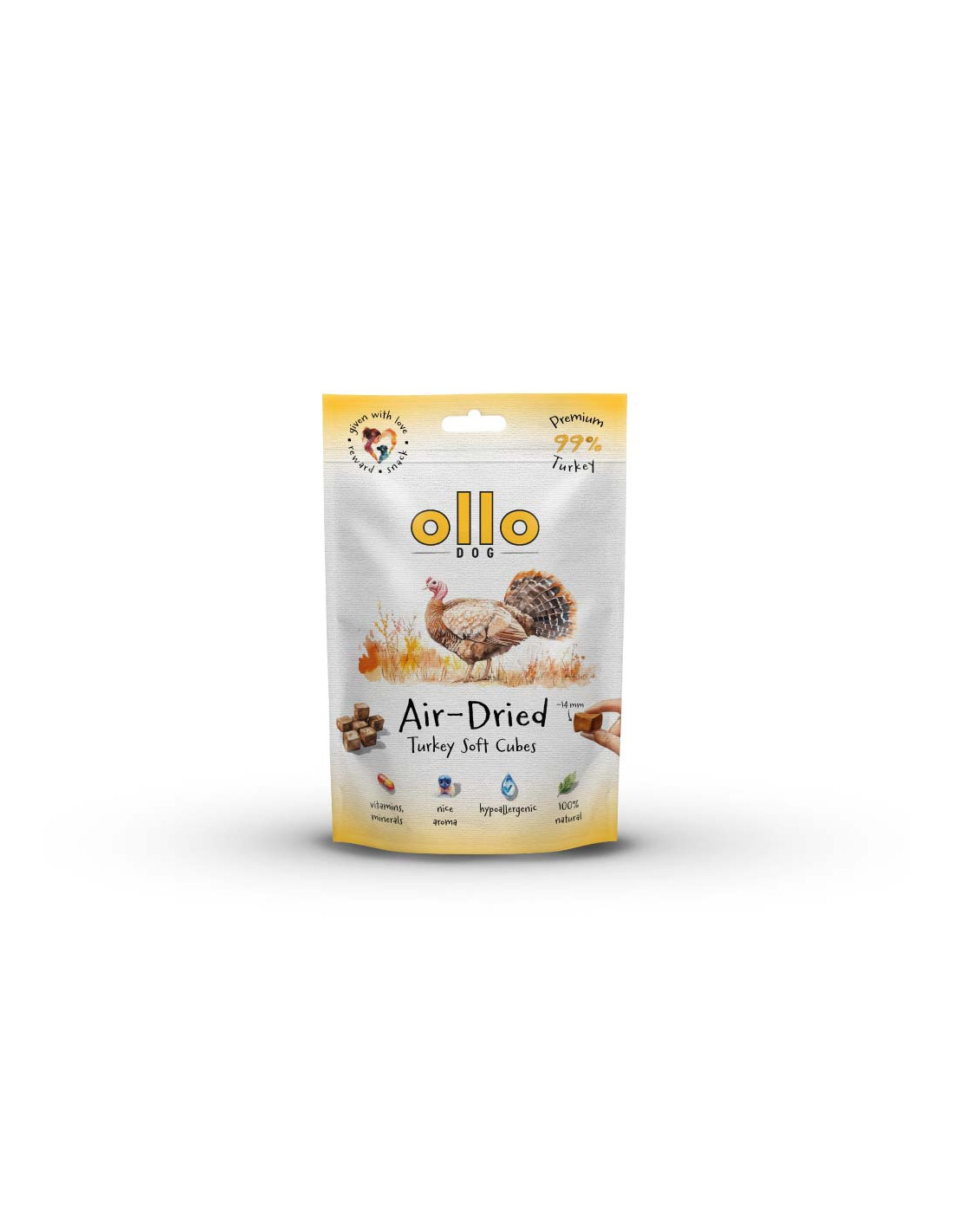 Przysmaki dla psa Ollo Air-Dried Turkey Soft Cubes to naturalne, hipoalergiczne, monobiałkowe smaczki z indyka. Są delikatnie suszone powietrzem. W kształcie kostek o wymiarach ok 14 mm. W 100% naturalny produkt, stworzony z myślą o psach wszystkich ras i w każdym wieku. Są miękkie i monobiałkowe, co jest niezwykle istotne dla psów z alergiami pokarmowymi oraz tych z wrażliwym żołądkiem.