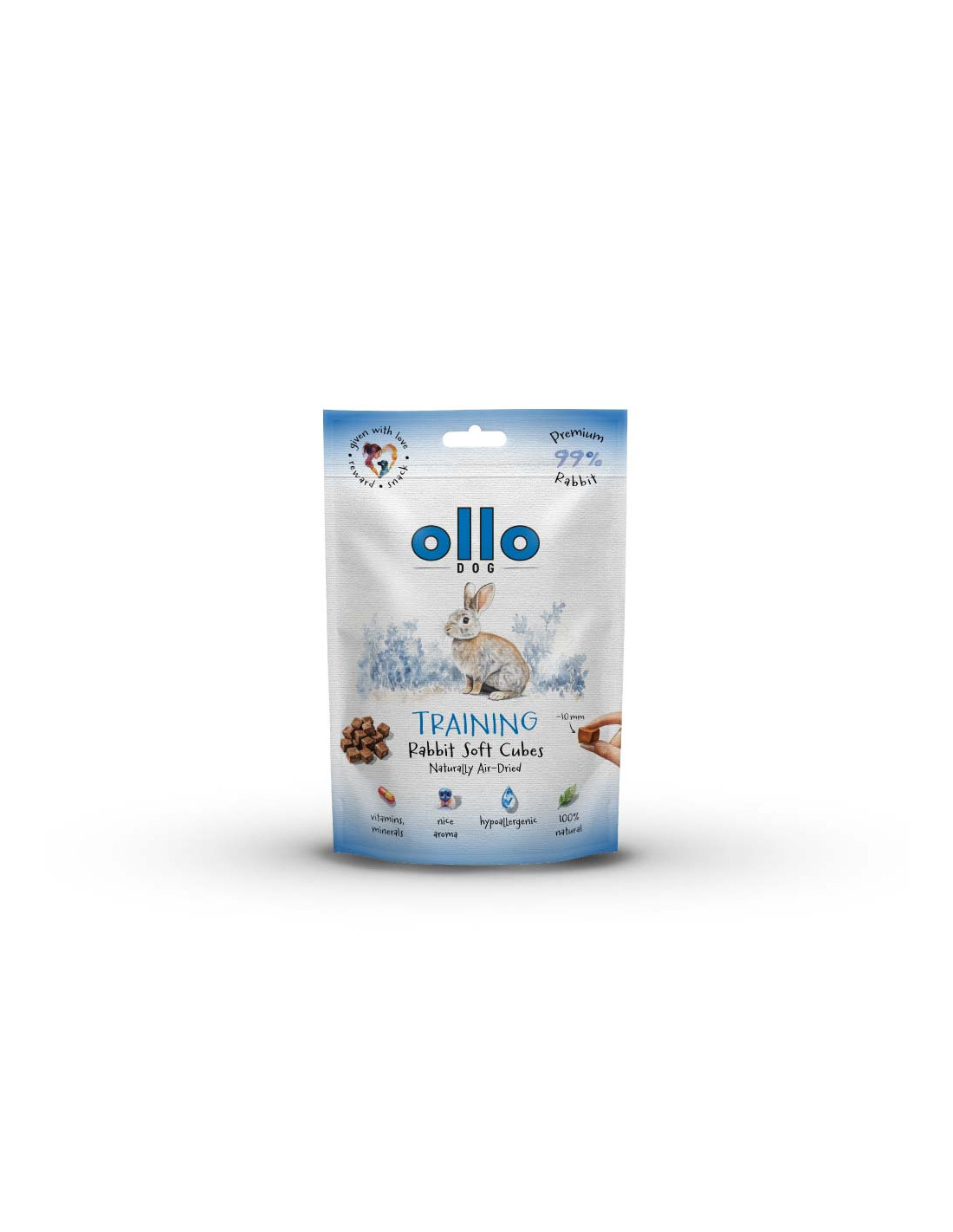 Przysmaki dla psa Ollo Air-Dried Training Rabbit Soft Cubes to naturalne, hipoalergiczne, monobiałkowe smaczki z królika. Są delikatnie suszone powietrzem. W kształcie kostek o wymiarach ok 10 mm. W 100% naturalny produkt, stworzony z myślą o psach wszystkich ras i w każdym wieku. Są miękkie i monobiałkowe, co jest niezwykle istotne dla psów z alergiami pokarmowymi oraz tych z wrażliwym żołądkiem.