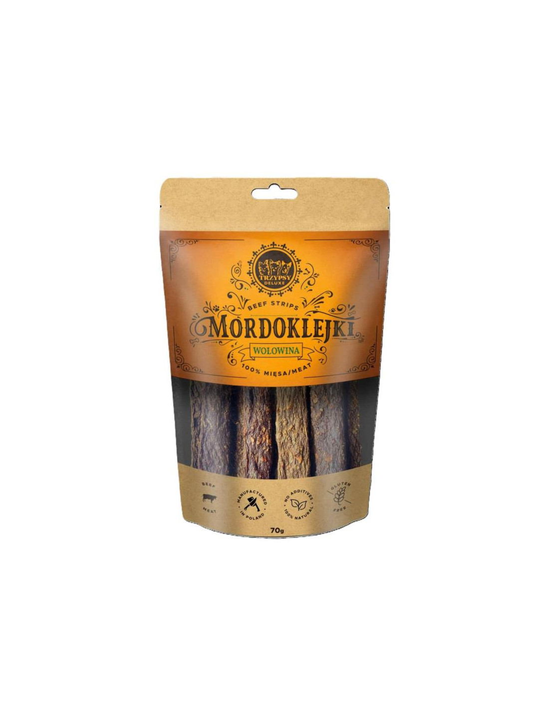 TRZYPSY DELUXE Mordoklejki to w pełni naturalne gryzaki dla psów, wykonane ze 100% mięsa w formie podłużnych pasków. Nie zawierają konserwantów ani barwników. Przysmak ten jest smaczny i pożywny, stanowi doskonałe uzupełnienie codziennej diety naszego pupila. Idealnie sprawdzą się jako nagroda.