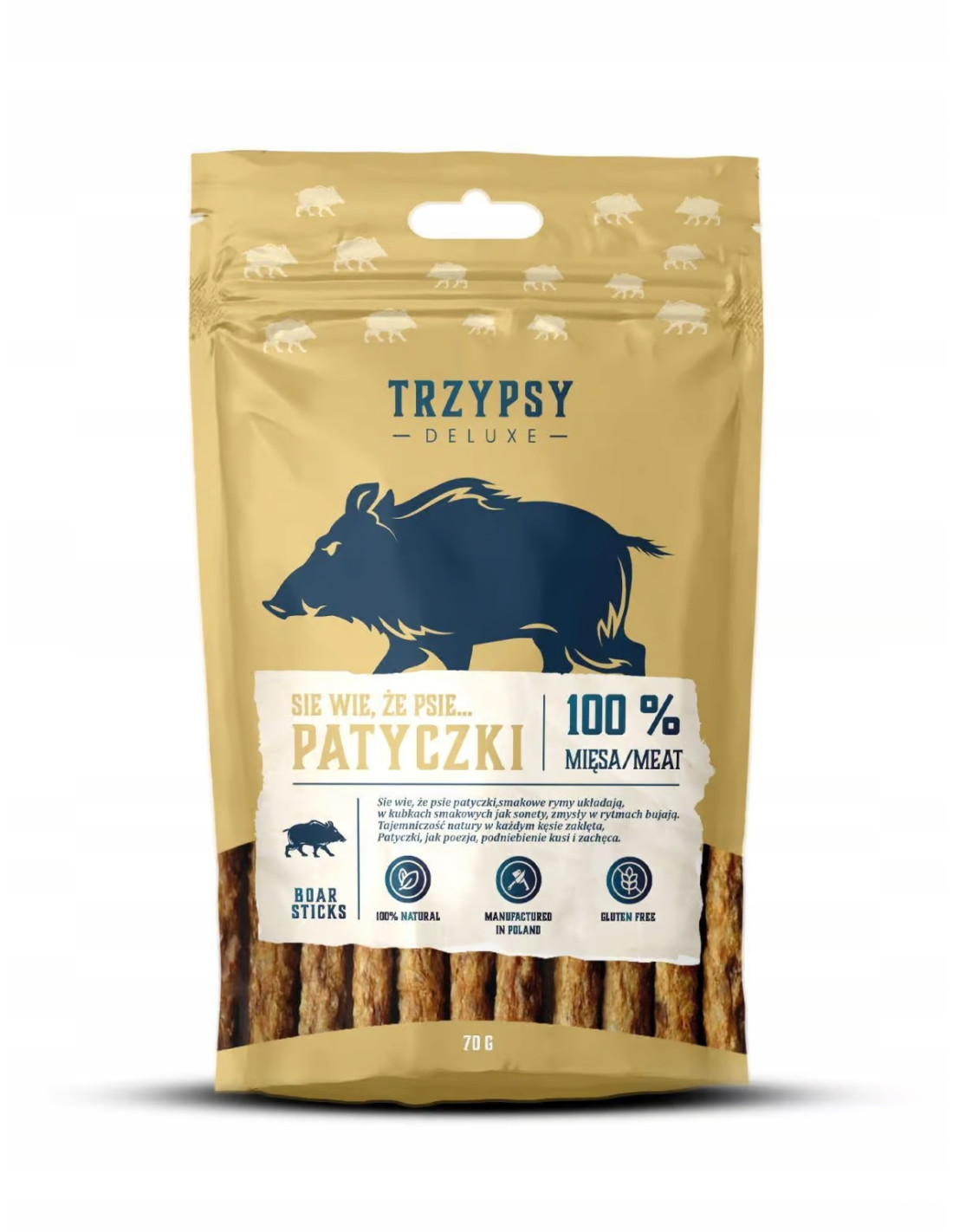 TRZYPSY DELUXE Się Wie, że Psie... Patyczki z królika to w pełni naturalne, miękkie przysmaki dla psów, wyprodukowane ze 100% mięsa w formie patyczków. Jeden patyczek ma około 11,5 cm długości i jest bardzo łatwy do podzielenia. Nie zawierają konserwantów, barwników, sztucznych wypełniaczy. Przysmak jest niezwykle aromatyczny i pożywny, stanowi doskonałe uzupełnienie codziennej diety każdego pupila. Idealnie sprawdzą się jako nagroda.