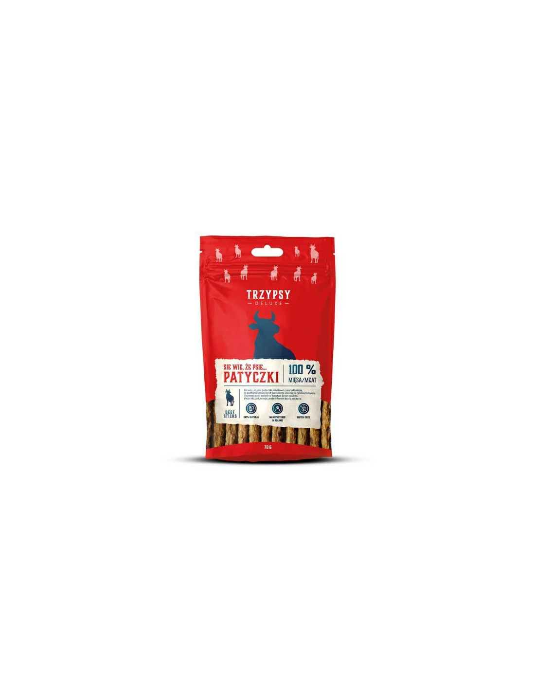 TRZYPSY DELUXE Się Wie, że Psie... Patyczki z królika to w pełni naturalne, miękkie przysmaki dla psów, wyprodukowane ze 100% mięsa w formie patyczków. Jeden patyczek ma około 11,5 cm długości i jest bardzo łatwy do podzielenia. Nie zawierają konserwantów, barwników, sztucznych wypełniaczy. Przysmak jest niezwykle aromatyczny i pożywny, stanowi doskonałe uzupełnienie codziennej diety każdego pupila. Idealnie sprawdzą się jako nagroda.