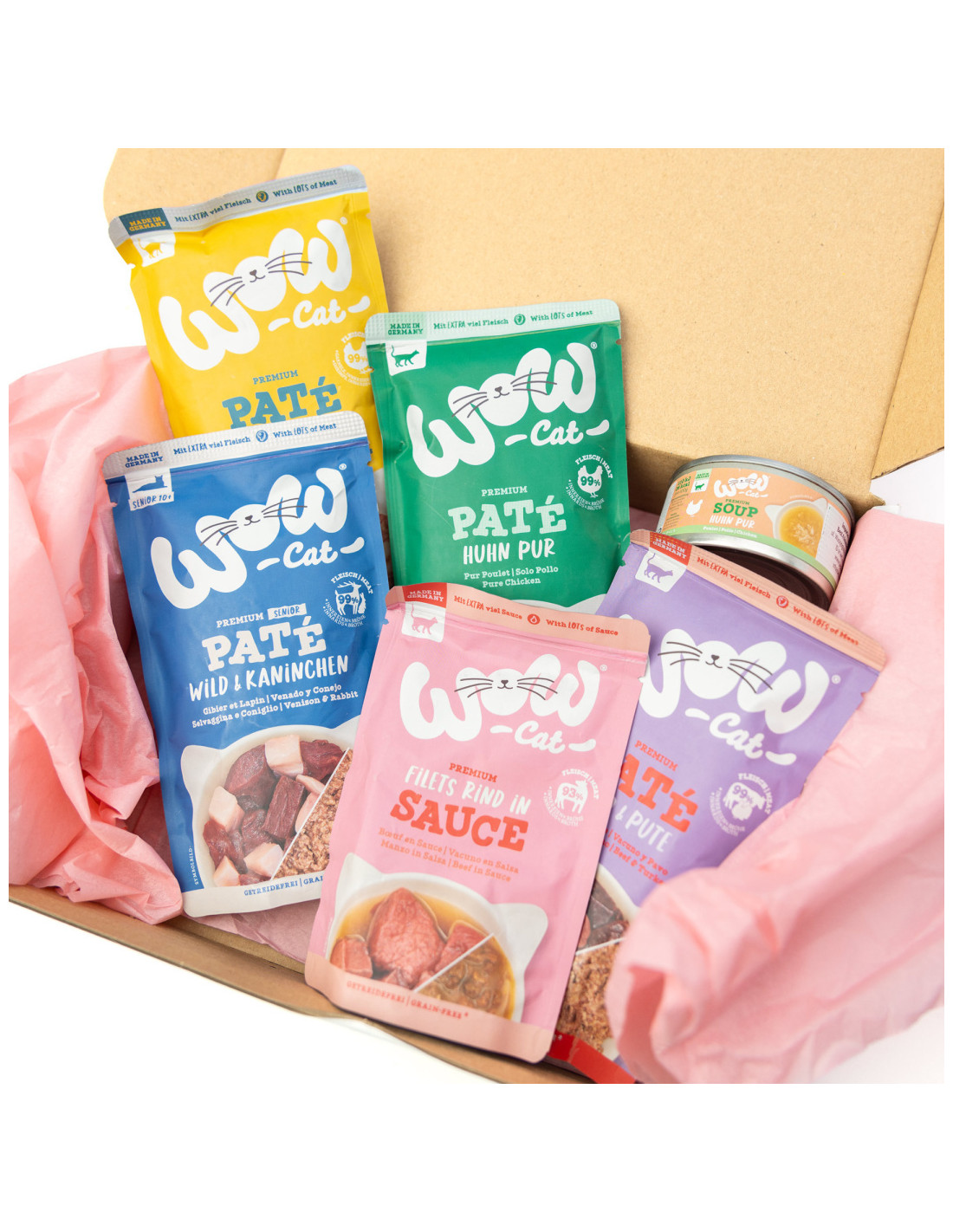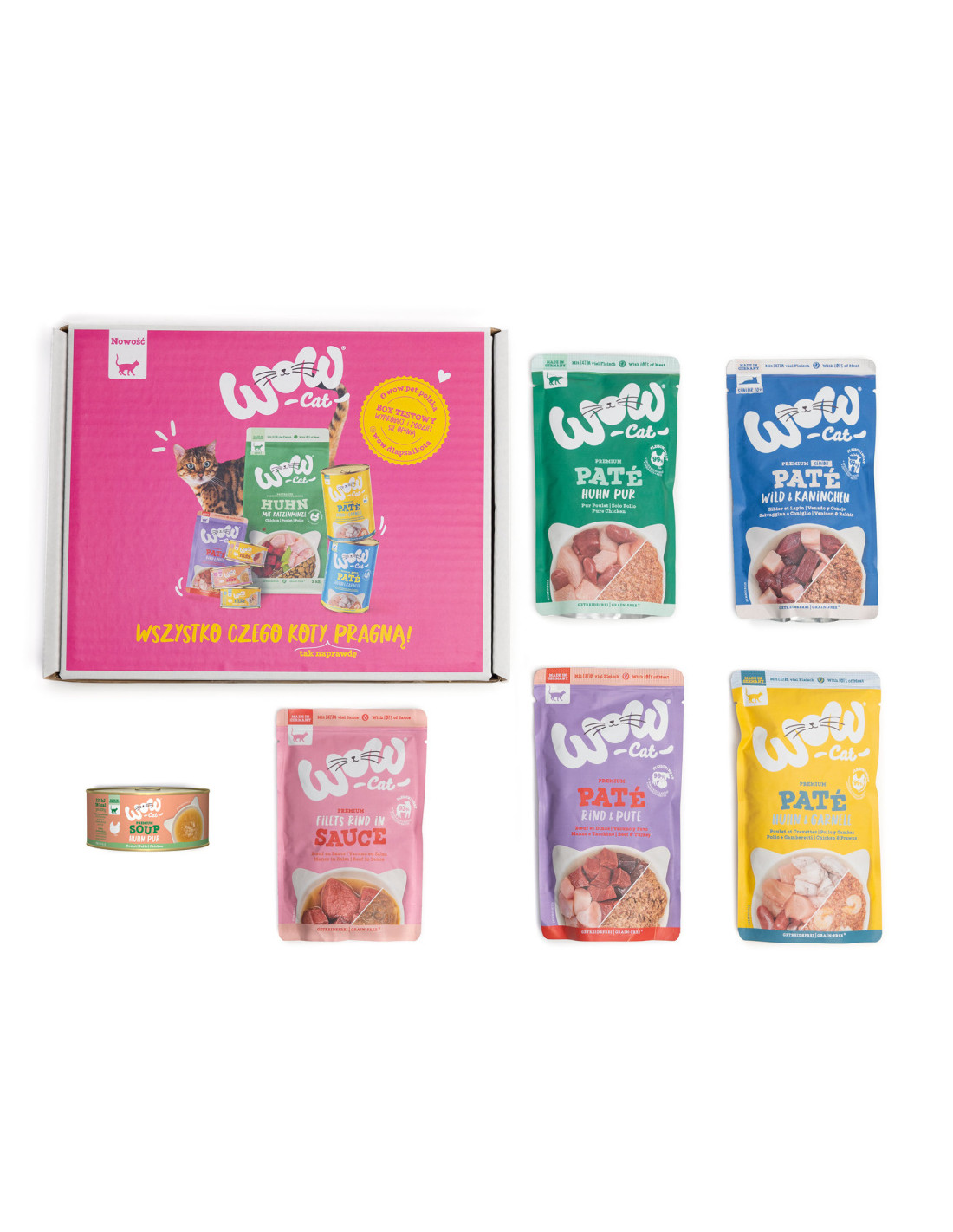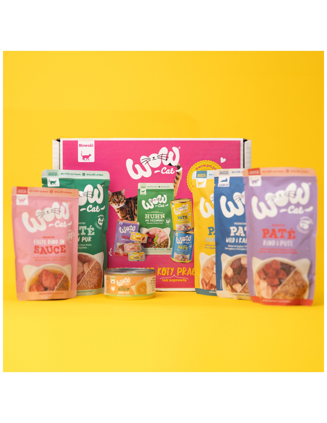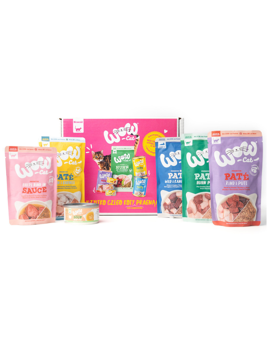 WOW CAT BOX to zestaw 6 przepysznych karm do rozpieszczania kociego podniebienia! W różnych smakach i konsystencjach: wyśmienita zupa, pyszne kawałki mięsa w dużej ilości sosu i delikatne pasztety. Nawet najbardziej wybredne koty będą mruczeć z zadowolenia.