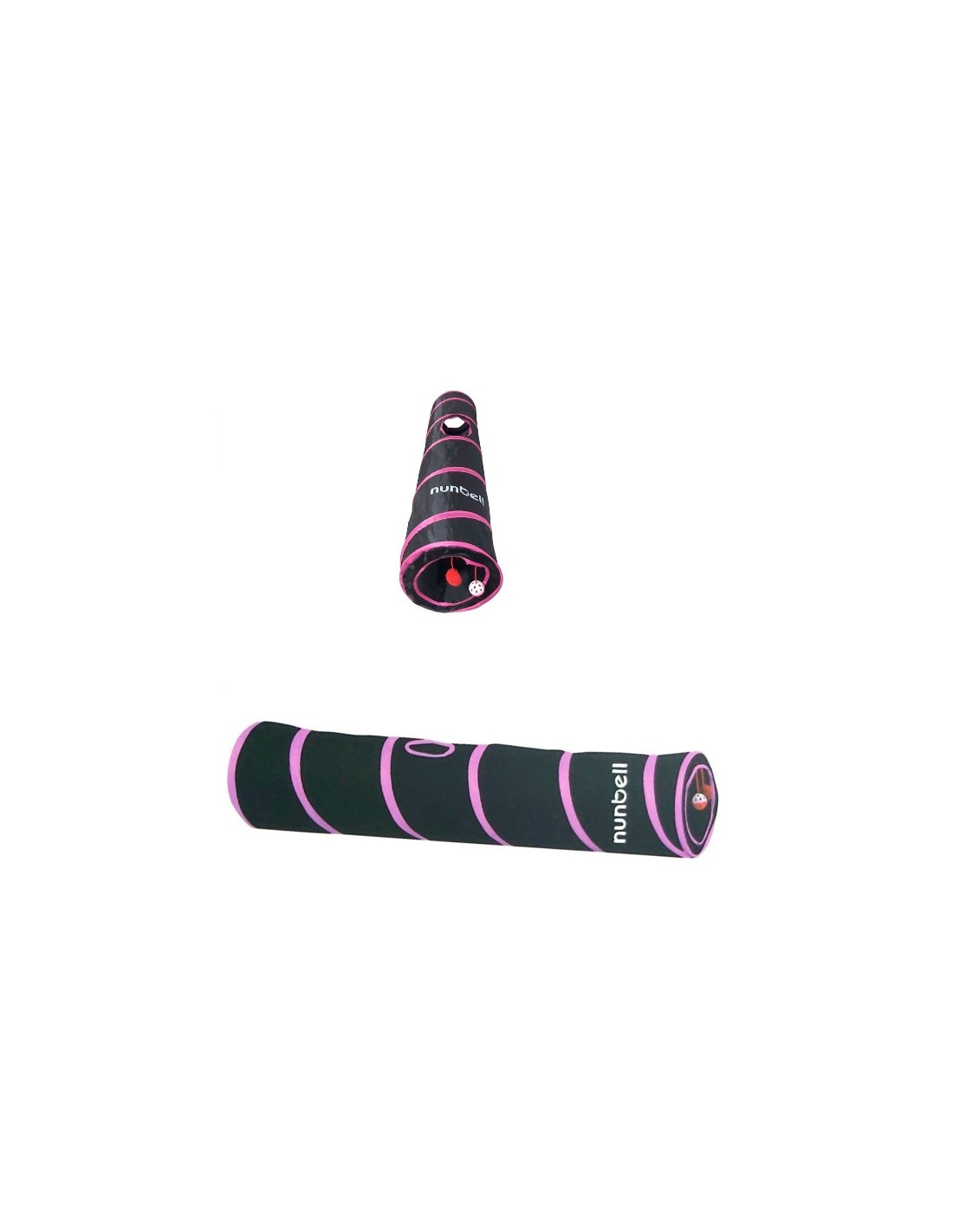 Podłużny tunel dla kotów zakończony wiszącymi zabawkami, zachęcające kota do zabawy.